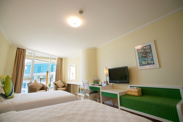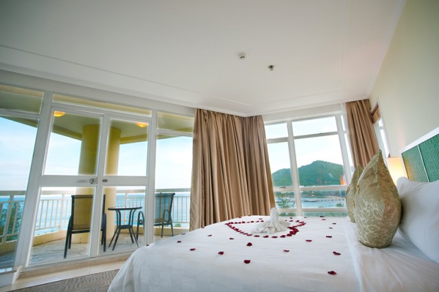 豪華海景房,面積35平方米,樓層2-9層,有陽臺,180度海景,大床(2*2米),雙標(1.35*2米),90%有浴缸 免費寬帶