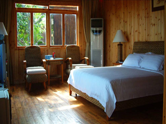 三亞蜈支洲島度假中心屬熱帶海洋性氣候,全年溫和氣爽,四季怡人。由于小島地處三亞海棠灣,避開了臺風走廊,所以不同于一般只能生長灌木的北部小島,這里喬木高大挺拔,灌木繁茂葳蕤,如天然織就的一塊厚重的綠毯披在島上,麗質天成。小島地貌美麗而有層次:島的中部坡地逶迤,起伏平緩,草木紛亂,藤蔓纏結,花紫果綠,蟬噪鳥鳴。西部及北部平緩延伸入海,形成一彎路玉帶狀的銀色沙灘,沙質均勻細膩,色澤潔白如雪,海水由淺入深,顏色由透明而碧綠繼而淺藍,后而深藍,明麗動人層次分明。東部與南部則是現(xiàn)兩峰相連,最高峰海拔79.9米,其氣勢與洶涌仄相向,懸崖壁立如削,人跡難至,其下礁石林立,奇形萬狀,驚濤拍岸,泡沫如雪。大風或大潮時,海浪咆哮奔騰激起的浪花可高達十米,形成獨特的山海奇觀。小島現(xiàn)已被開發(fā)了三分之一,都位于西北部。建設者獨具匠心,巧妙地利用了地形地貌,使人工設施掩映期間,不減其風采,反增其情趣。這里椰影婆娑,綠草成蔭,竹制建筑娉婷綽約,泳池碧波蕩漾。草地上小徑蜿蜒,點綴些秋千、蹺蹺板、石凳、竹制躺椅,編就了一幅世外天堂的畫面。